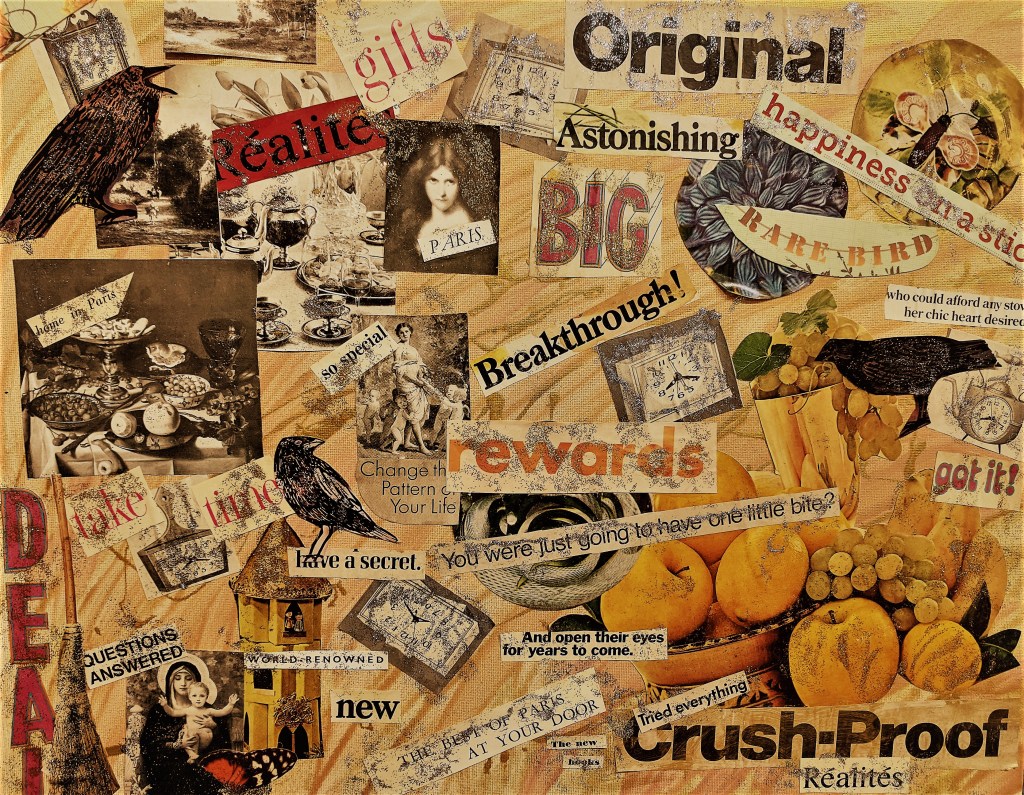 Every January I spend one evening in a friend’s art studio with an eclectic group of woman, fueled on wine, crudité and chocolate. We bundle up against the chilly night and face a blank canvas and consider what we wish the new year to be. How will we feel? What do we need? What matters? Old books and magazines consigned to what one would think would be the end of their journey are repurposed into visions, dreams and what is innately pleasing. I look forward to this night filled with promise and with what I call my witch vibe, know what is possible. I am always amazed by what shows up on that canvas by the end of the night, what I didn’t realize I needed more than anything.